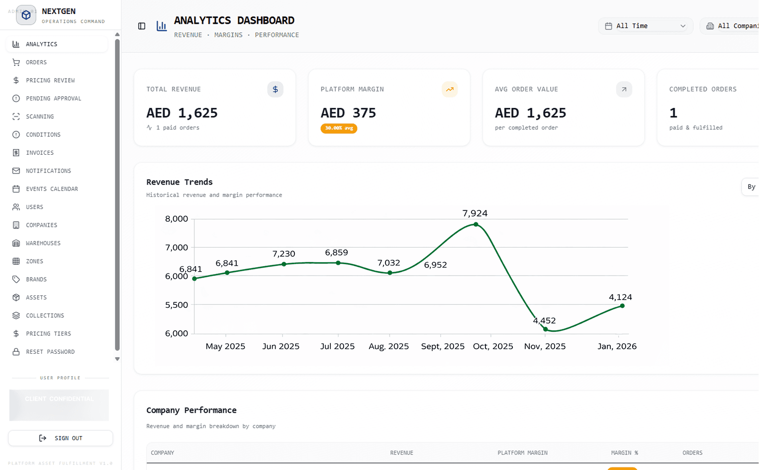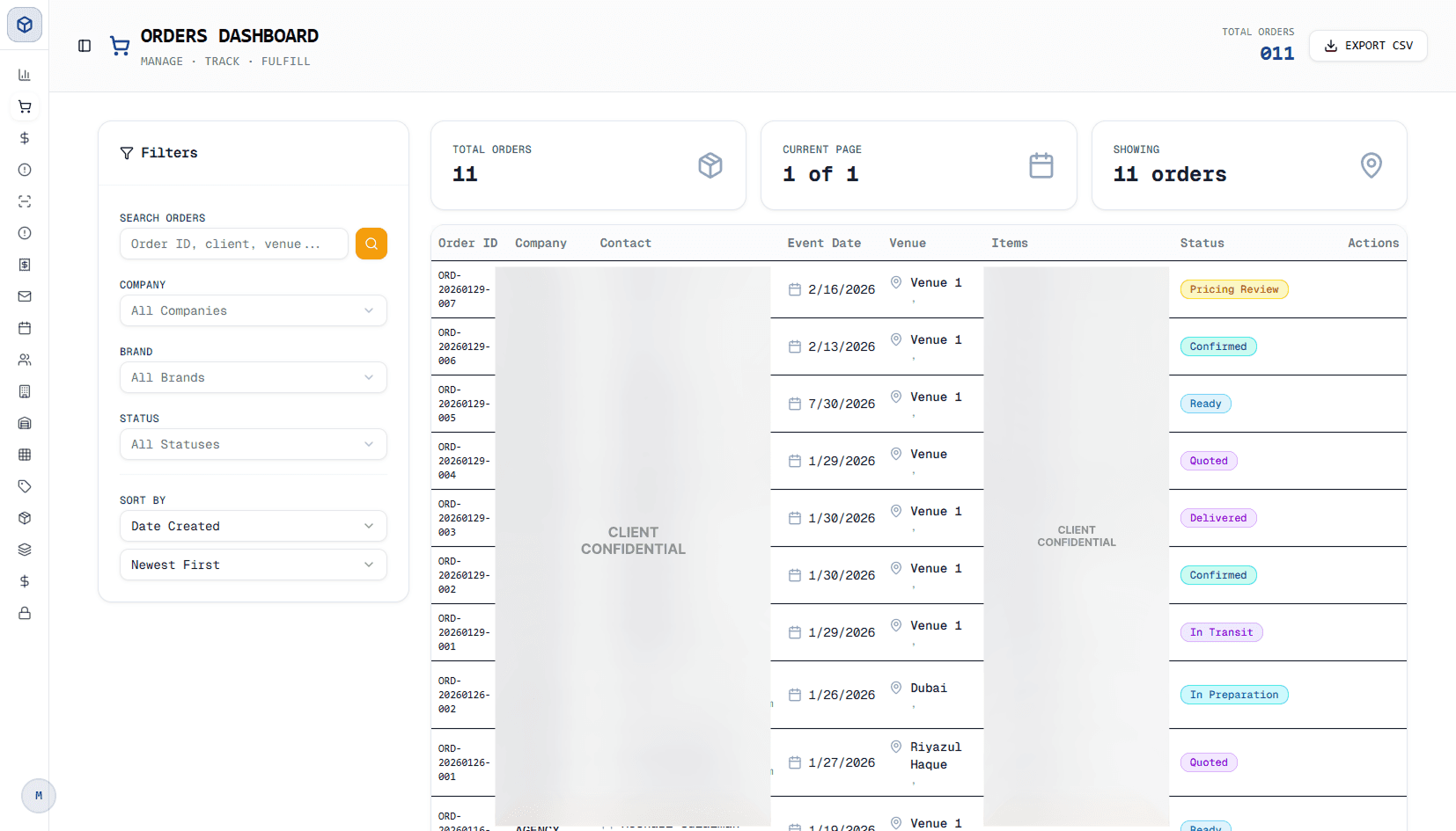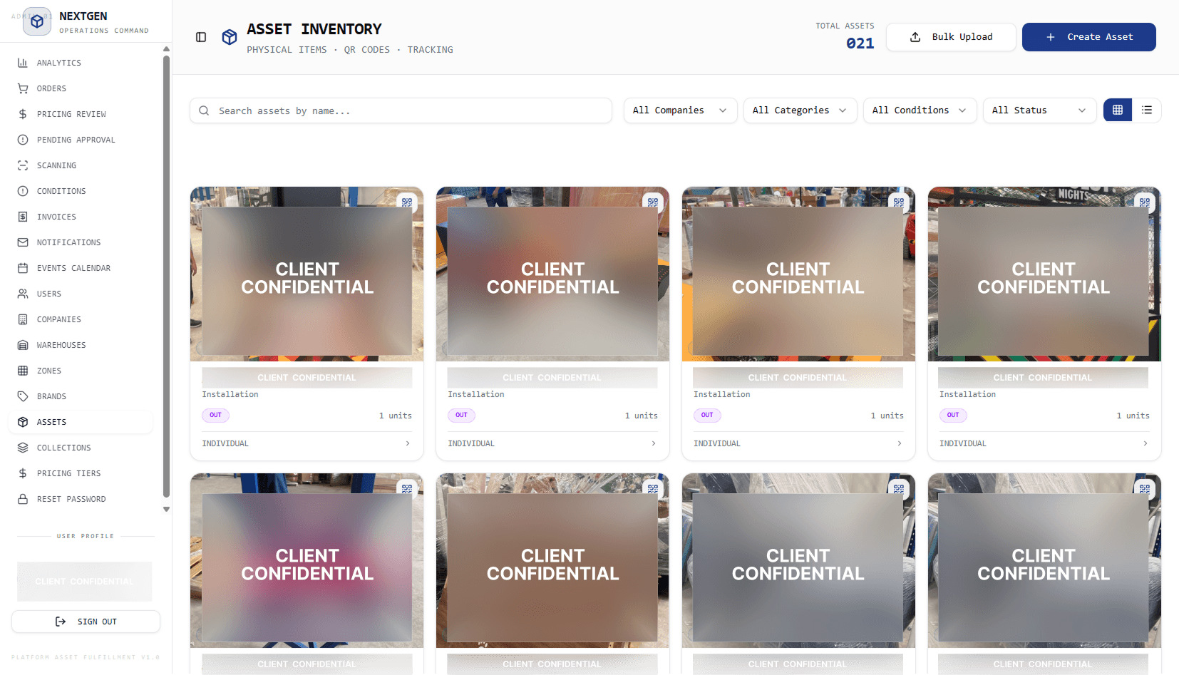 Fulfilment Hub is a multi-tenant B2B platform built for events and logistics companies managing thousands of physical brand assets across multiple clients, warehouses, and delivery partners. It replaces the spreadsheets, email chains, and manual tracking that most operations teams rely on — with a unified system covering the full asset lifecycle from catalog through to invoicing.